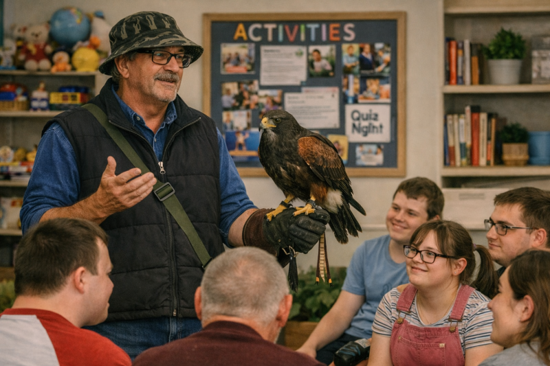 Our long-established Owl and Bird of Prey care home visits are Therapeutic, Sensory and very different, at the same time, giving participants a unique opportunity to meet Barn Owl Rocky, Eagle Owl Norman, Kestrel Doris and other of our birds, with fees helping fund Owl and Bird of prey rescue and bird care.