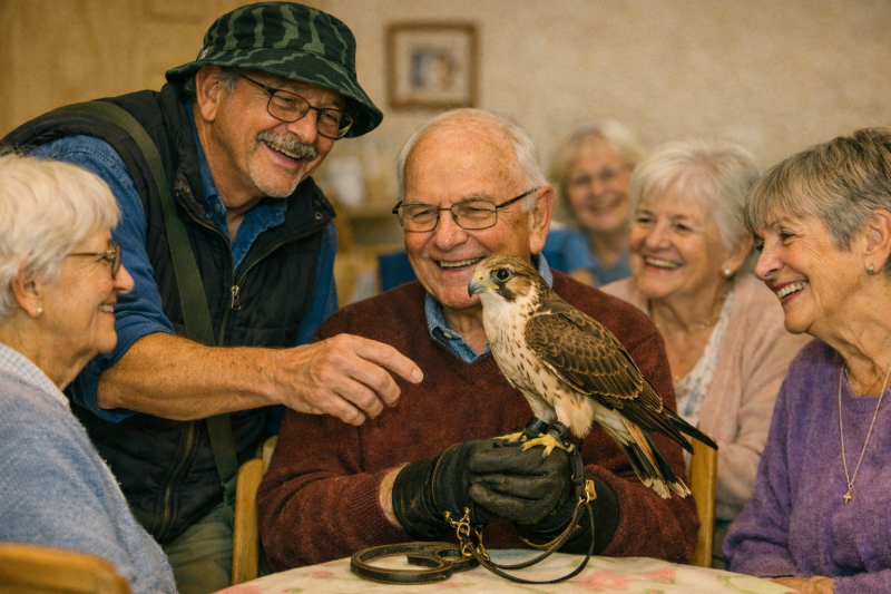 Undertaken in any residential lounge and social area, on the day, residents have the opportunity to meet and interact with our specially trained birds, such as Dorris the Kestrel, ,Rocky the Barn owl, Norman the Eagle Owl, Bert the Harris Hawk and others.